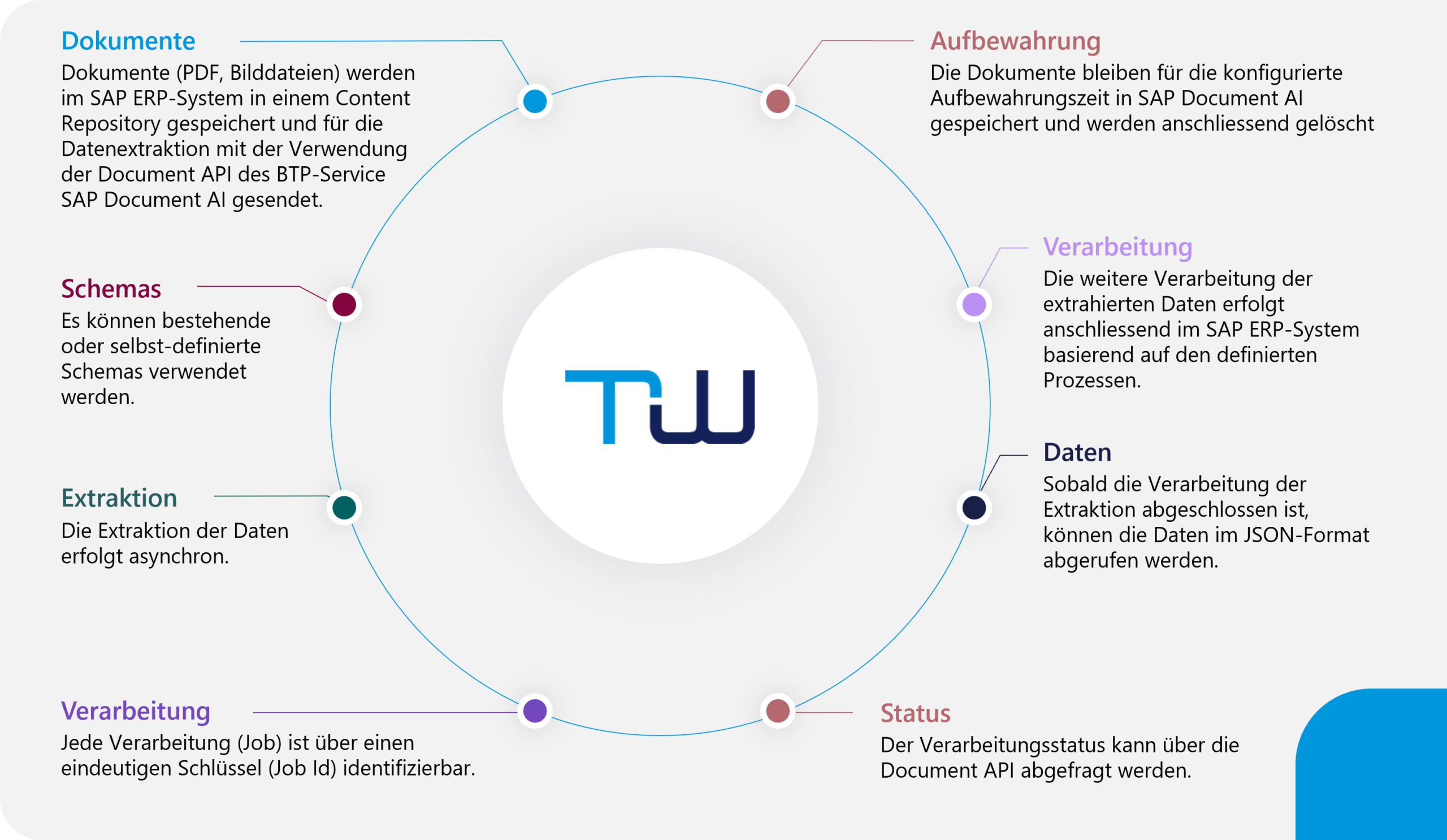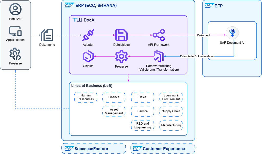 TW DocAI unterstützt, mit Verwendung des BTP-Service SAP Document AI, bei der Verarbeitung grosser Mengen von Geschäftsdokumenten, die eine Vielzahl an Inhalten und Strukturen enthalten.